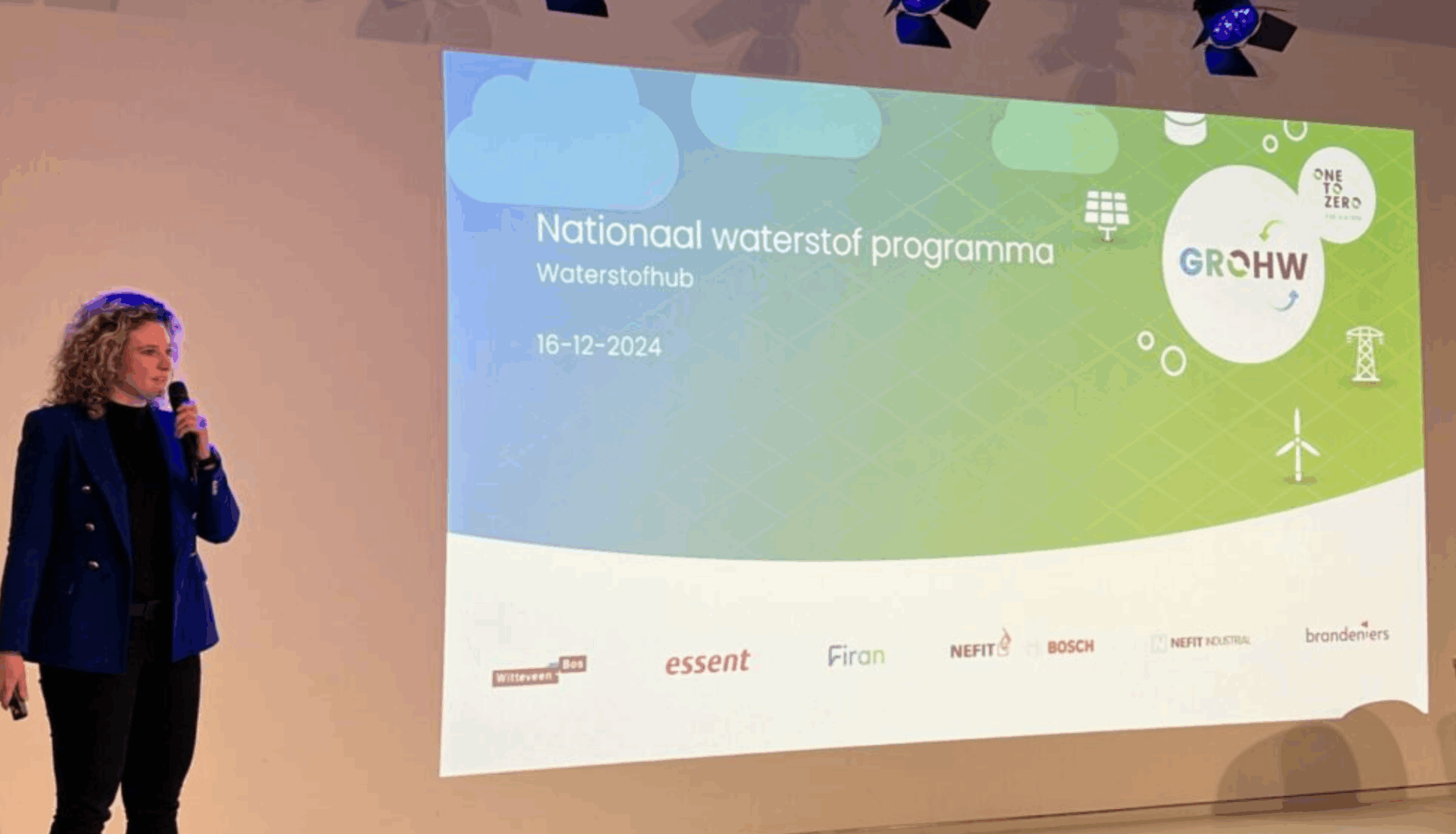 Afgelopen week presenteerde Lisa van Lieshout, Hydrogen Business Developer Essent, GROHW bij het afsluitende evenement voor ’24 van het Nationaal Waterstof Programma (NWP). In het NWP werken de overheid en de waterstofsector samen aan het onderzoeken en stimuleren van de bijdrage van waterstof voor de energietransitie. Het in december gehouden evenement richtte zich onder andere op succesfactoren voor waterstofhubs, waarbij GROHW als lokale groene waterstofketen één van de koplopers is.